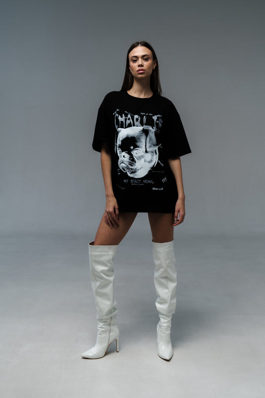 Oversized Unisex Cotton T-Shirt with "Charlie Griffon" Print – Black