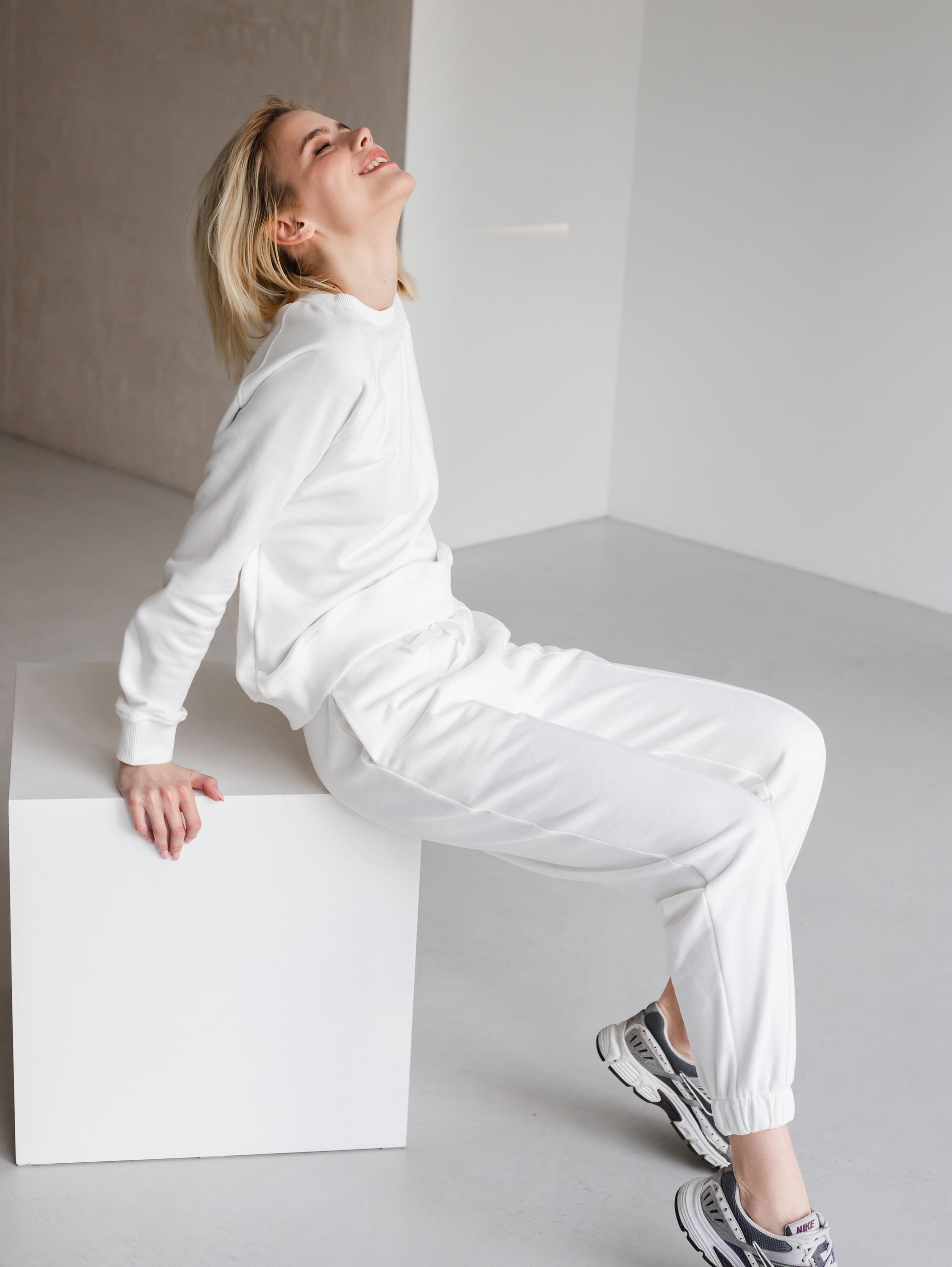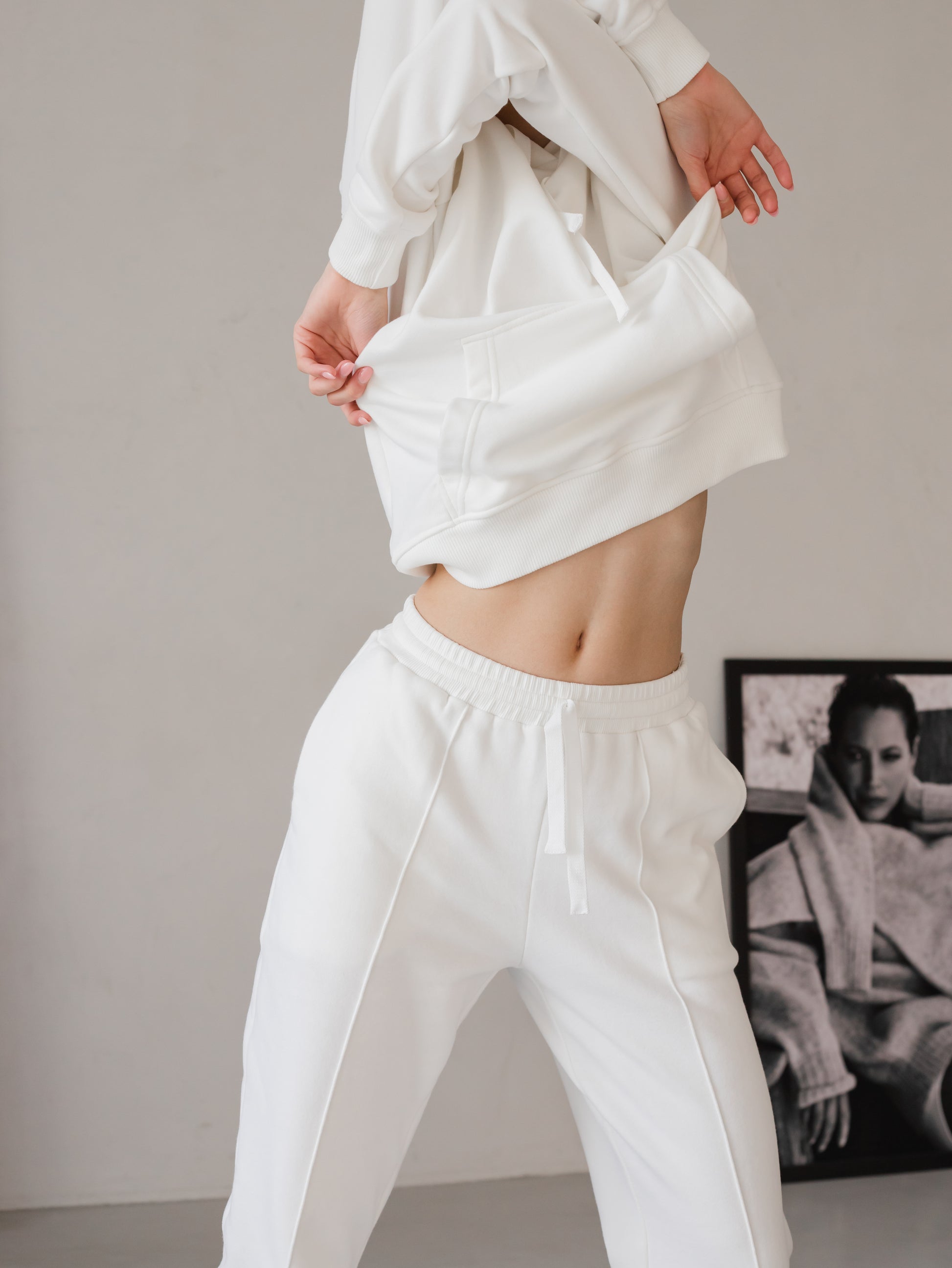 - Універсальні варіанти стилю: поєднуйте ці джоггери з відповідним білим худі для однотонного образу або контрастуйте з ними темним верхнім одягом для стильного зимового вбрання.